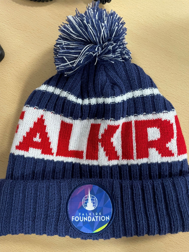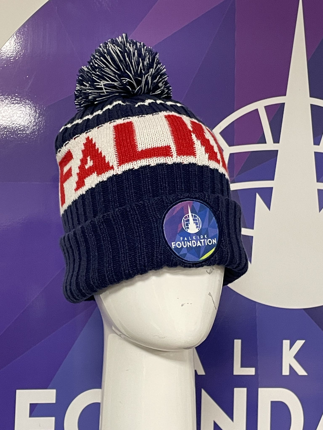 100% Acrylic fleece lined, blue winter bobble hat; embroidered with the Falkirk Foundation logo.